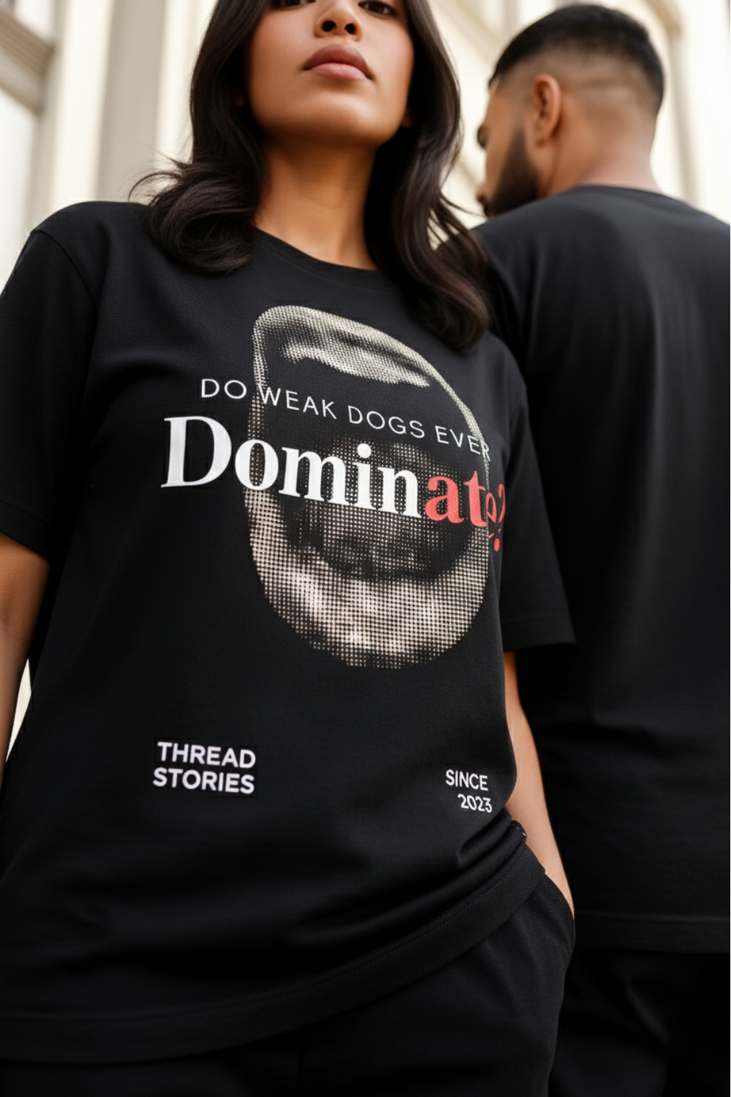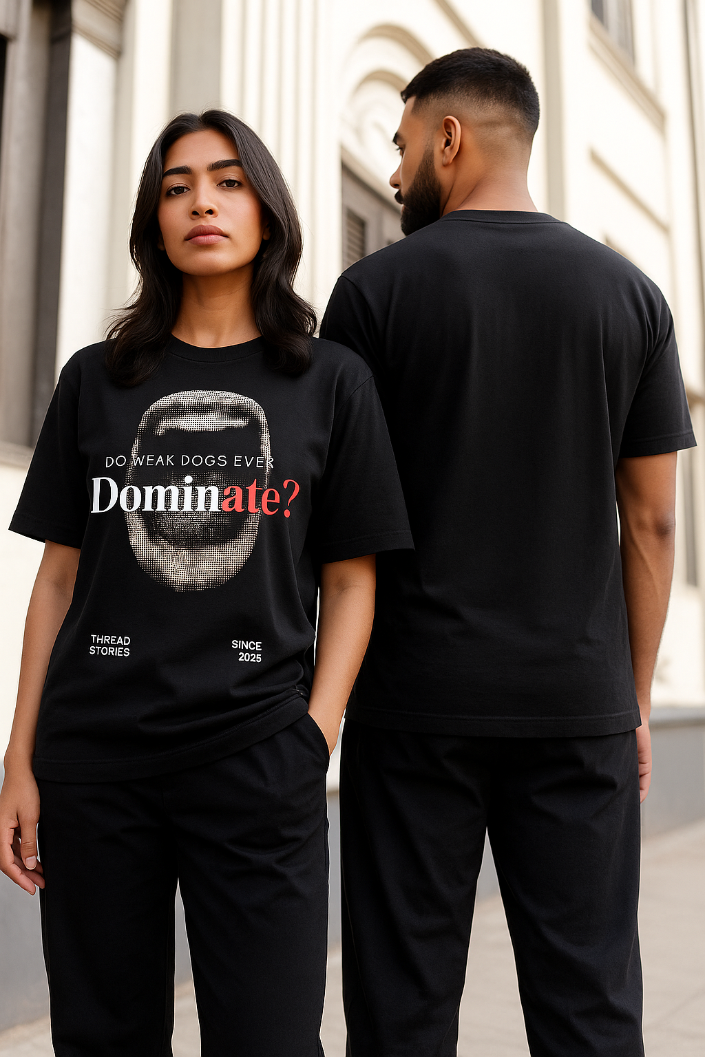 Challenge the ordinary and wear your mindset with our bold oversized tee — designed for those who refuse to blend in. Featuring the unapologetic question “Do weak dogs ever dominate?” in striking typography across a powerful graphic, this piece is more than fashion — it’s a statement.